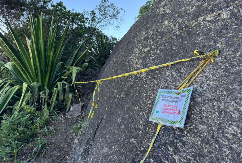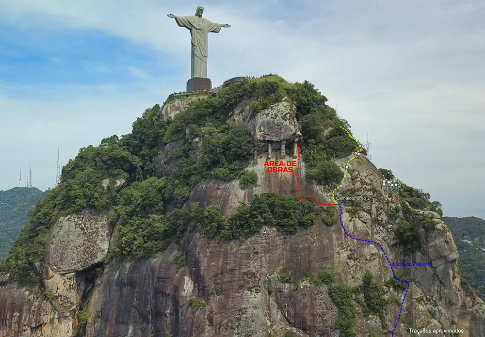 1) Do not climb the routes on the south face of Corcovado located between the Diretíssima Sul route and the Saint-Exupèry Dihedral on weekdays (Monday to Friday) due to construction work. This is due to the risk of falling debris and the fact that these routes pass through the area affected by the works. The risk is minimized on weekends because there are no scheduled activities at the construction site.